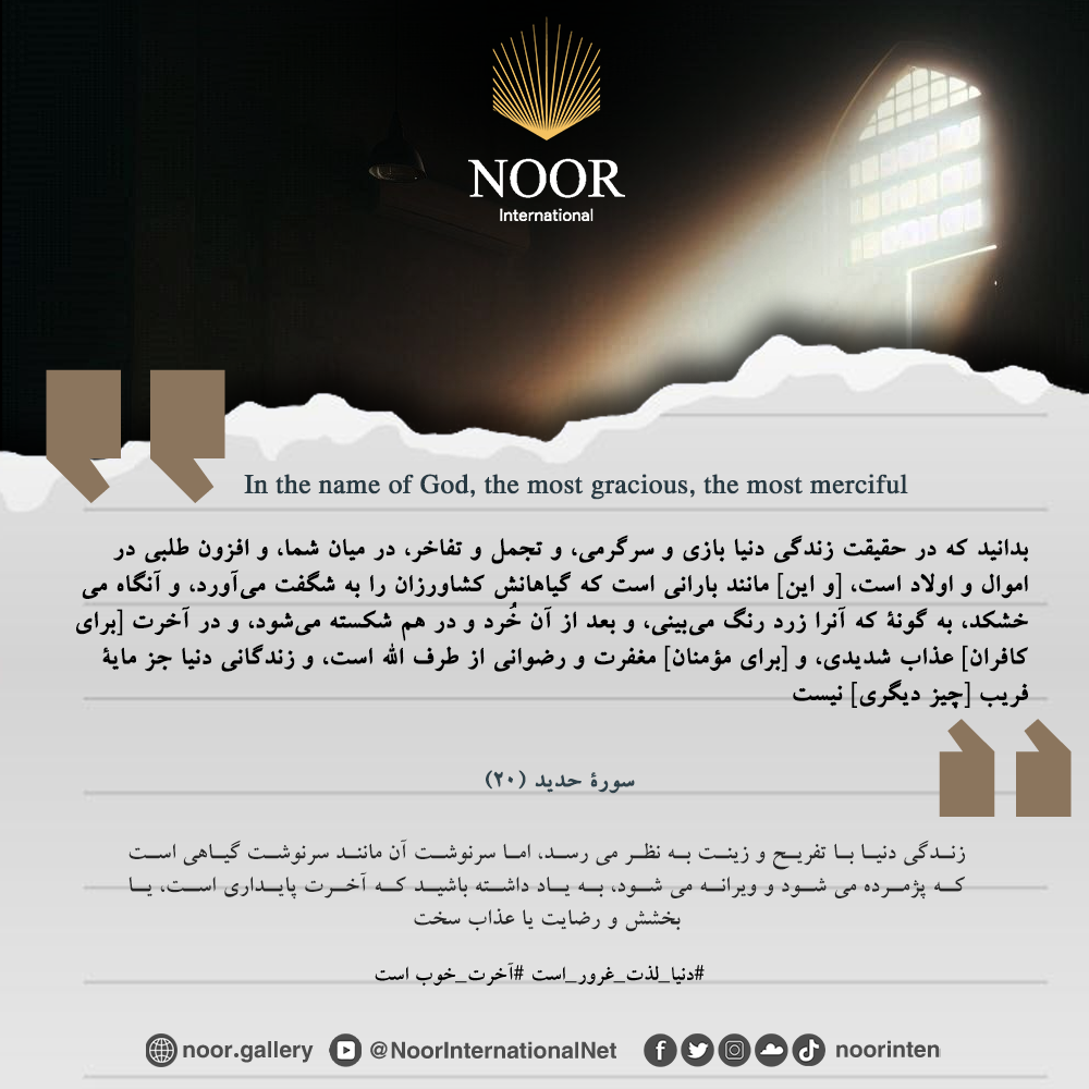 زندگی دنیا با تفریح و زینت به نظر می رسد، اما سرنوشت آن مانند سرنوشت گیاهی است که پژمرده می شود و ویرانه می شود، به یاد داشته باشید که آخرت پایداری است، یا بخشش و رضایت یا عذاب سخت. #دنیا_لذت_غرور_است #آخرت_خوب است