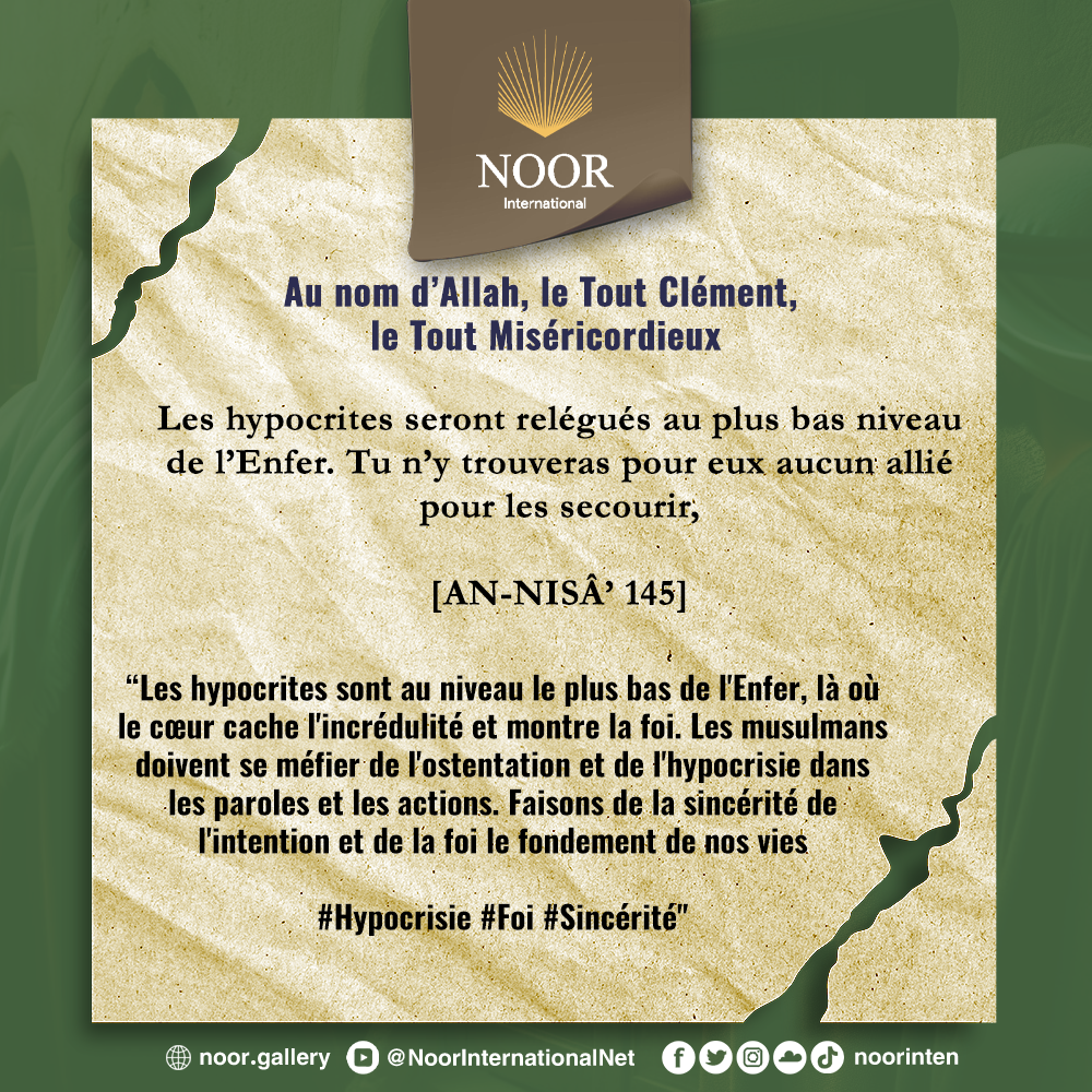 Les hypocrites sont au niveau le plus bas de l'Enfer, là où le cœur cache l'incrédulité et montre la foi. Les musulmans doivent se méfier de l'ostentation et de l'hypocrisie dans les paroles et les actions. Faisons de la sincérité de l'intention et de la foi le fondement de nos vies. #Hypocrisie #Foi #Sincérité"