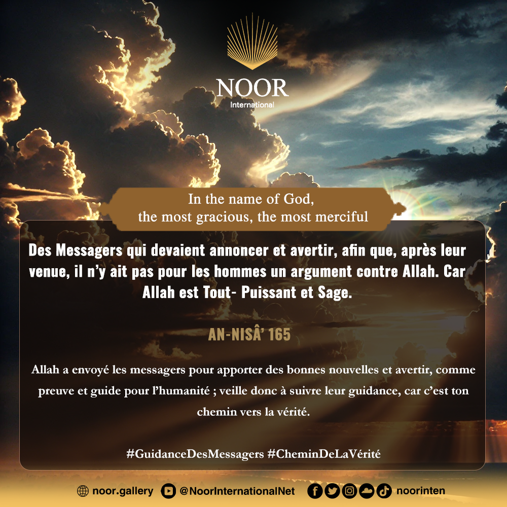 Allah a envoyé les messagers pour apporter des bonnes nouvelles et avertir, comme preuve et guide pour l’humanité ; veille donc à suivre leur guidance, car c’est ton chemin vers la vérité. #GuidanceDesMessagers #CheminDeLaVérité