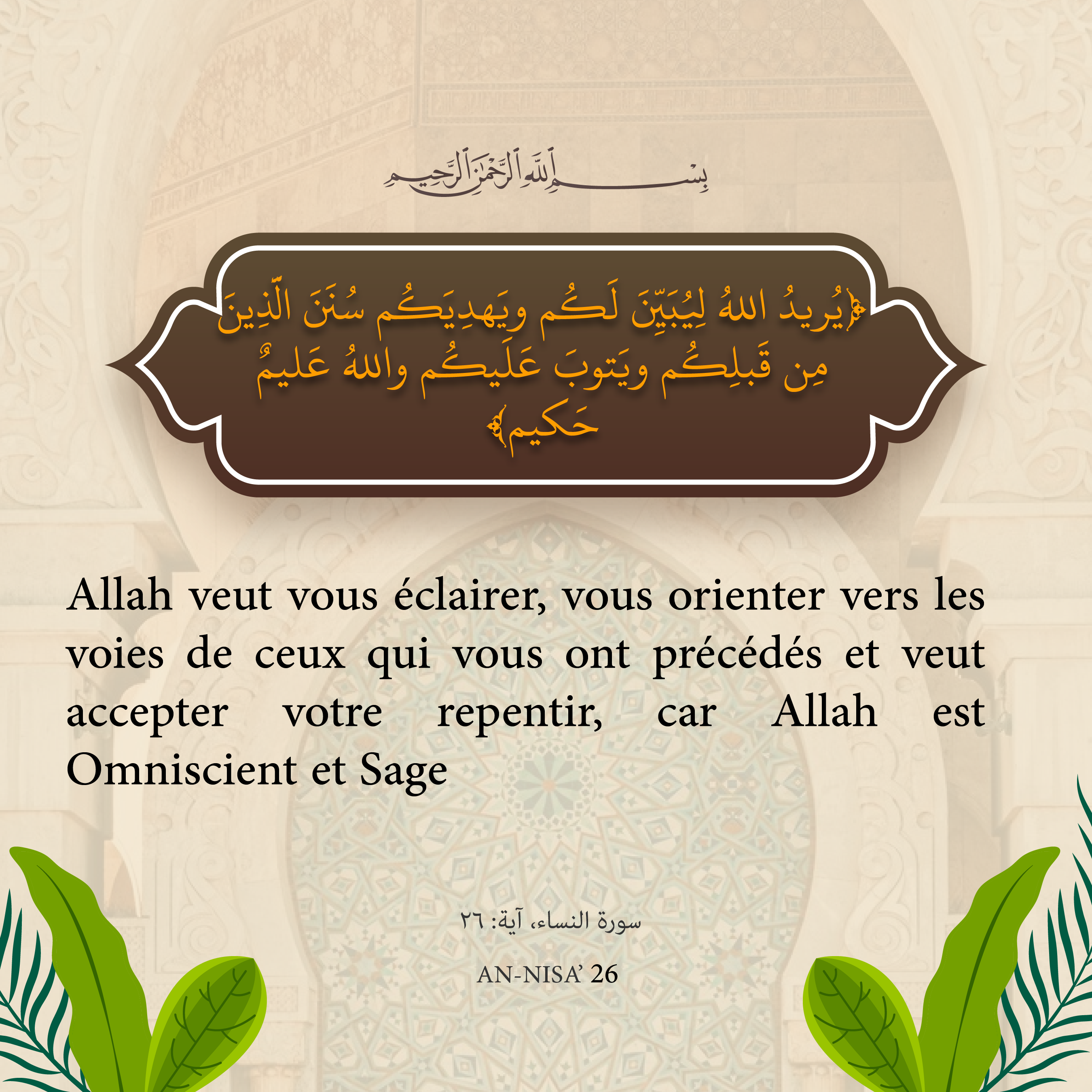 Allah veut vous éclairer, vous orienter vers les voies de ceux qui vous ont précédés et veut accepter votre repentir, car Allah est Omniscient et Sage.