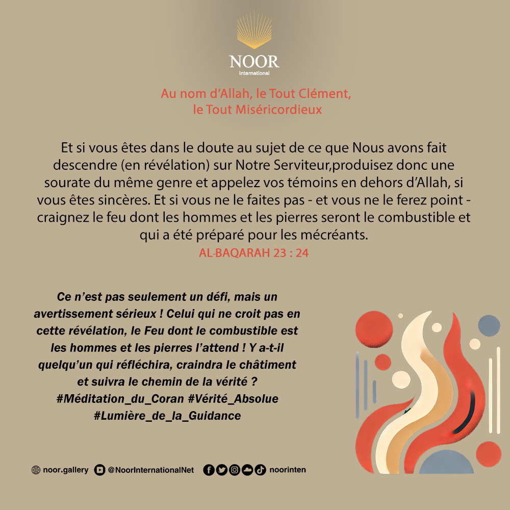 Ce n’est pas seulement un défi, mais un avertissement sérieux ! Celui qui ne croit pas en cette révélation, le Feu dont le combustible est les hommes et les pierres l’attend ! Y a-t-il quelqu’un qui réfléchira, craindra le châtiment et suivra le chemin de la vérité ?