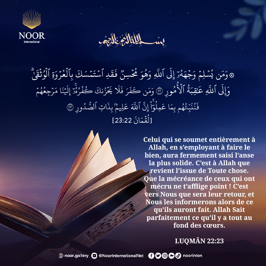 Celui qui se soumet entièrement à Allah, en s’employant à faire le bien, aura fermement saisi l’anse la plus solide. C’est à Allah que revient l’issue de Toute chose.