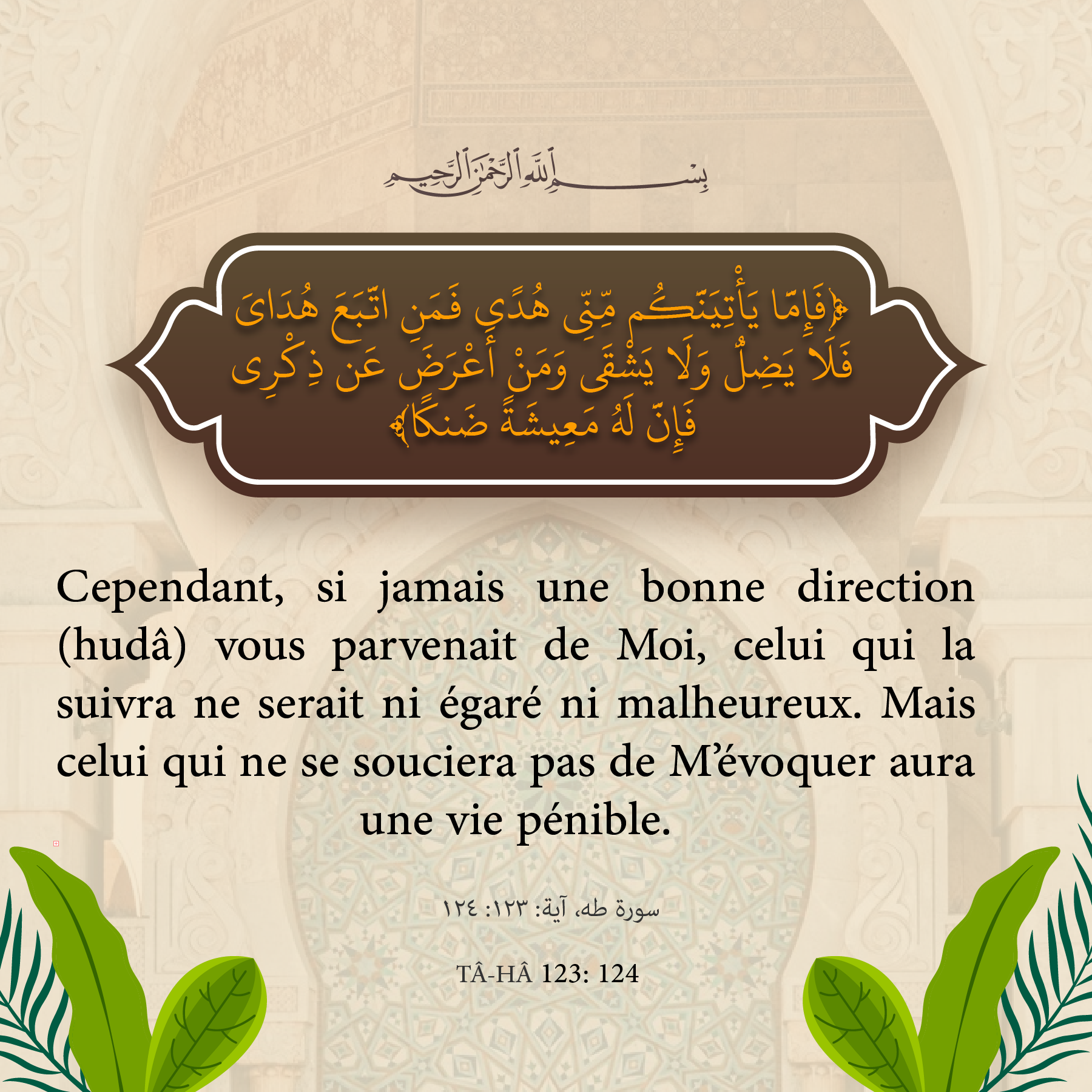 Cependant, si jamais une bonne direction (hudâ) vous parvenait de Moi, celui qui la suivra ne serait ni égaré ni malheureux.Mais celui qui ne se souciera pas de M’évoquer aura une vie pénible.