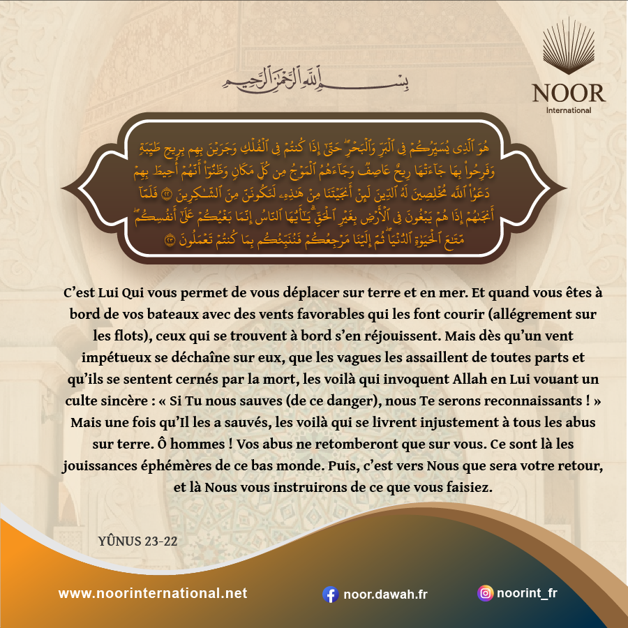 C’est Lui Qui vous permet de vous déplacer sur terre et en mer. Et quand vous êtes à bord de vos bateaux avec des vents favorables qui les font courir (allégrement sur les flots), ceux qui se trouvent à bord s’en réjouissent. Mais dès qu’un vent impétueux se déchaîne sur eux, que les vagues les assaillent de toutes parts et qu’ils se sentent cernés par la mort, les voilà qui invoquent Allah en Lui vouant un culte sincère : « Si Tu nous sauves (de ce danger), nous Te serons reconnaissants ! »Mais une fois qu’Il les a sauvés, les voilà qui se livrent injustement à tous les abus sur terre. Ô hommes ! Vos abus ne retomberont que sur vous. Ce sont là les jouissances éphémères de ce bas monde. Puis, c’est vers Nous que sera votre retour, et là Nous vous instruirons de ce que vous faisiez.