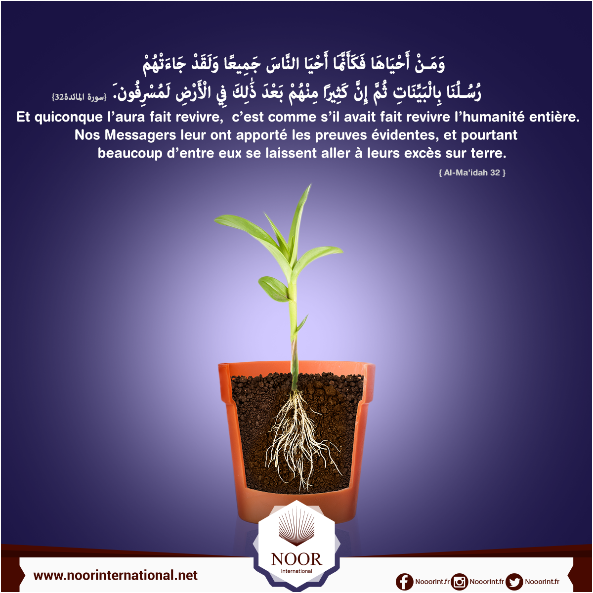 C’est pour cela que Nous avons prescrit aux Enfants d’Israël (la loi que voici) : Quiconque aura tué une personne sans que celle-ci n’ait commis un meurtre ou semé la corruption sur terre, c’est comme s’il avait tué l’humanité entière. Et quiconque l’aura fait revivre,[1] c’est comme s’il avait fait revivre l’humanité entière. Nos Messagers leur ont apporté les preuves évidentes, et pourtant beaucoup d’entre eux se laissent aller à leurs excès sur terre.