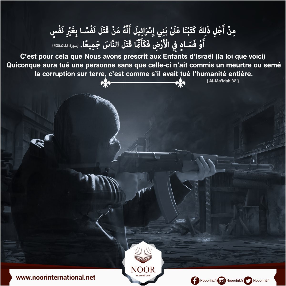 C’est pour cela que Nous avons prescrit aux Enfants d’Israël (la loi que voici) : Quiconque aura tué une personne sans que celle-ci n’ait commis un meurtre ou semé la corruption sur terre, c’est comme s’il avait tué l’humanité entière. Et quiconque l’aura fait revivre,[1] c’est comme s’il avait fait revivre l’humanité entière. Nos Messagers leur ont apporté les preuves évidentes, et pourtant beaucoup d’entre eux se laissent aller à leurs excès sur terre.