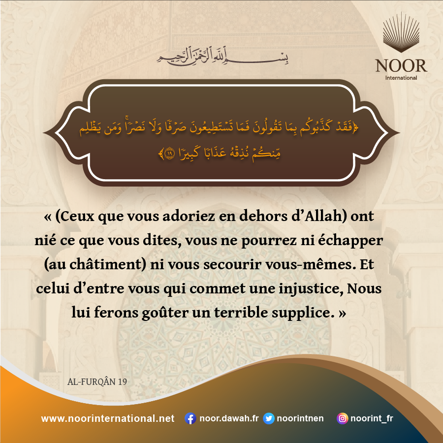 « (Ceux que vous adoriez en dehors d’Allah) ont nié ce que vous dites, vous ne pourrez ni échapper (au châtiment) ni vous secourir vous-mêmes. Et celui d’entre vous qui commet une injustice, Nous lui ferons goûter un terrible supplice. »