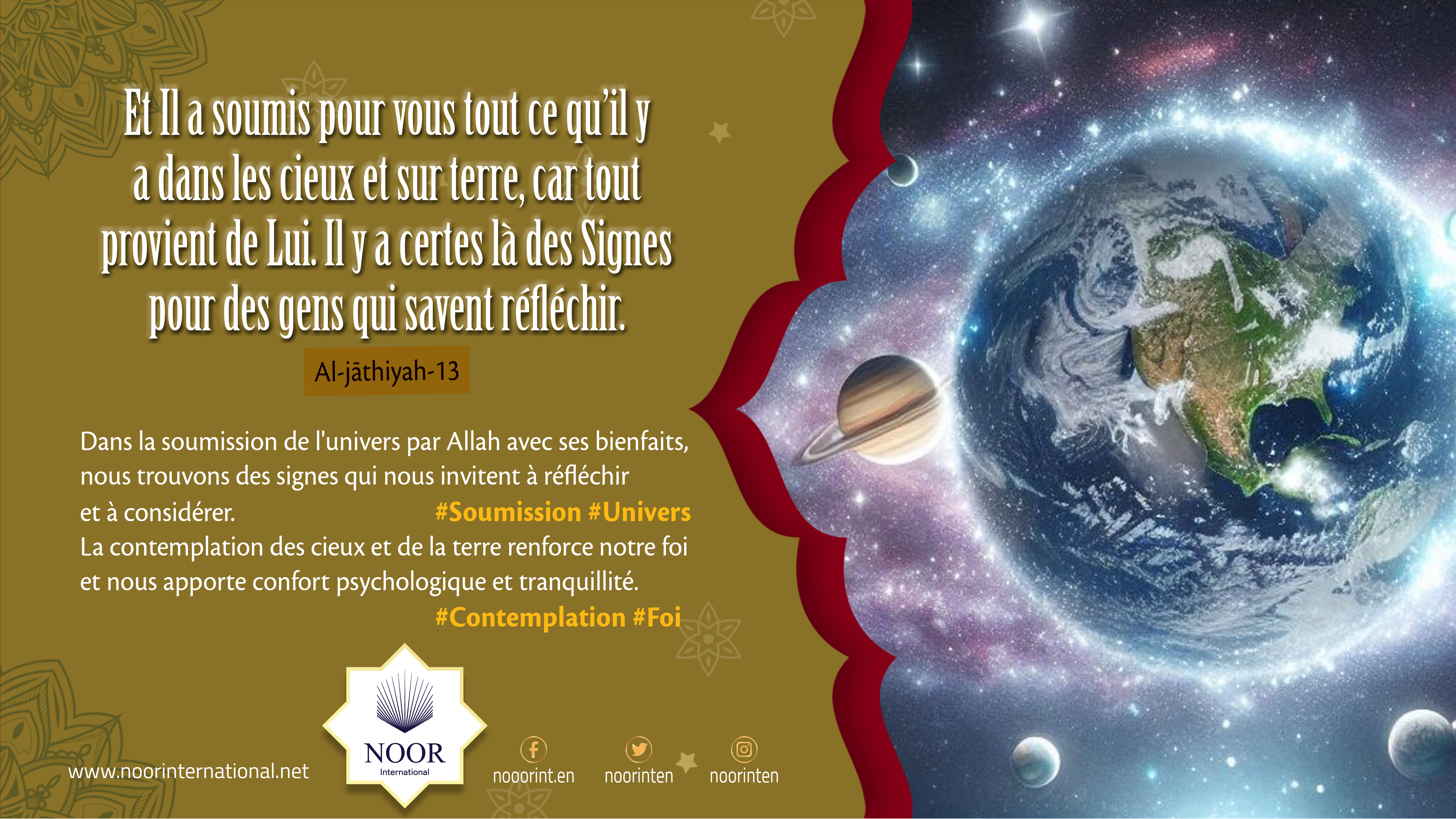 Et Il a soumis pour vous tout ce qu’il y a dans les cieux et sur terre, car tout provient de Lui. Il y a certes là des Signes pour des gens qui savent réfléchir.AL‑(JĀTHIYAH-13)