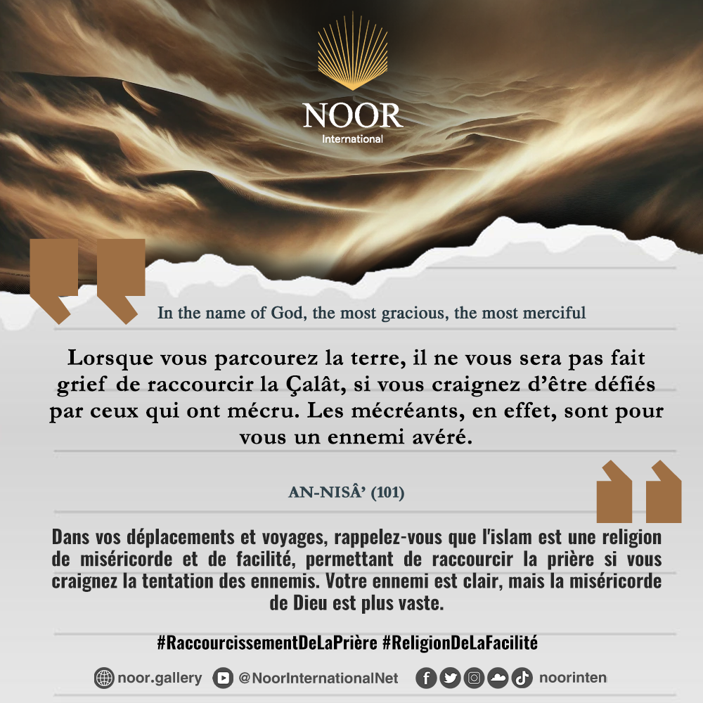 "Dans vos déplacements et voyages, rappelez-vous que l'islam est une religion de miséricorde et de facilité, permettant de raccourcir la prière si vous craignez la tentation des ennemis. Votre ennemi est clair, mais la miséricorde de Dieu est plus vaste." #RaccourcissementDeLaPrière #ReligionDeLaFacilité