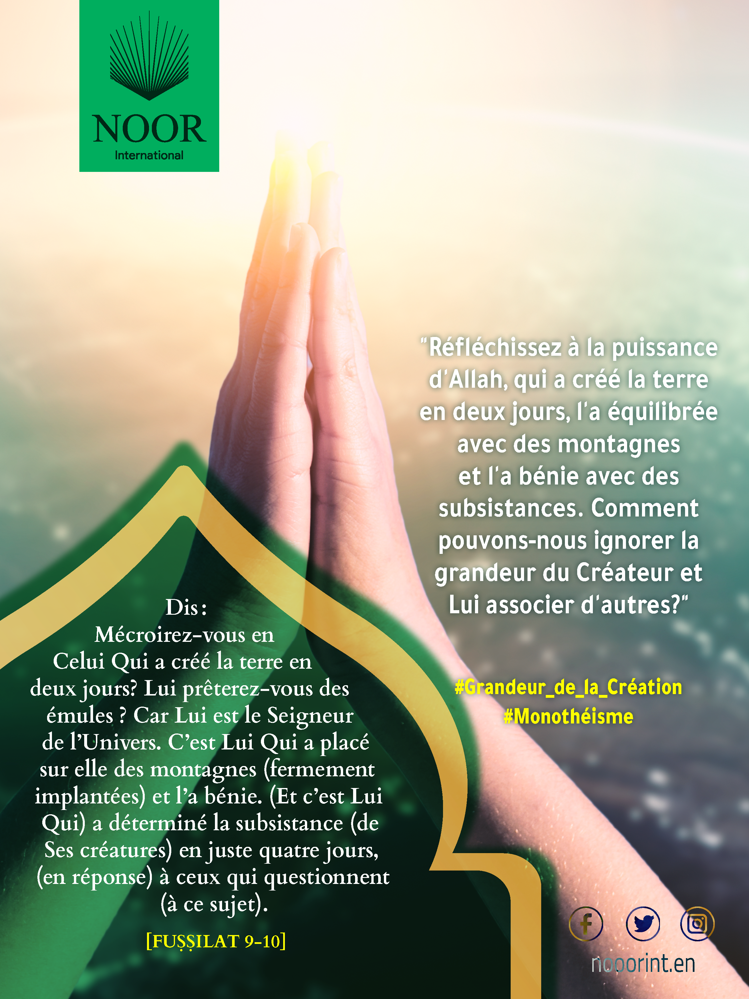 Réfléchissez à la puissance d'Allah, qui a créé la terre en deux jours, l'a équilibrée avec des montagnes et l'a bénie avec des subsistances. Comment pouvons-nous ignorer la grandeur du Créateur et Lui associer d'autres?" #Grandeur_de_la_Création #Monothéisme