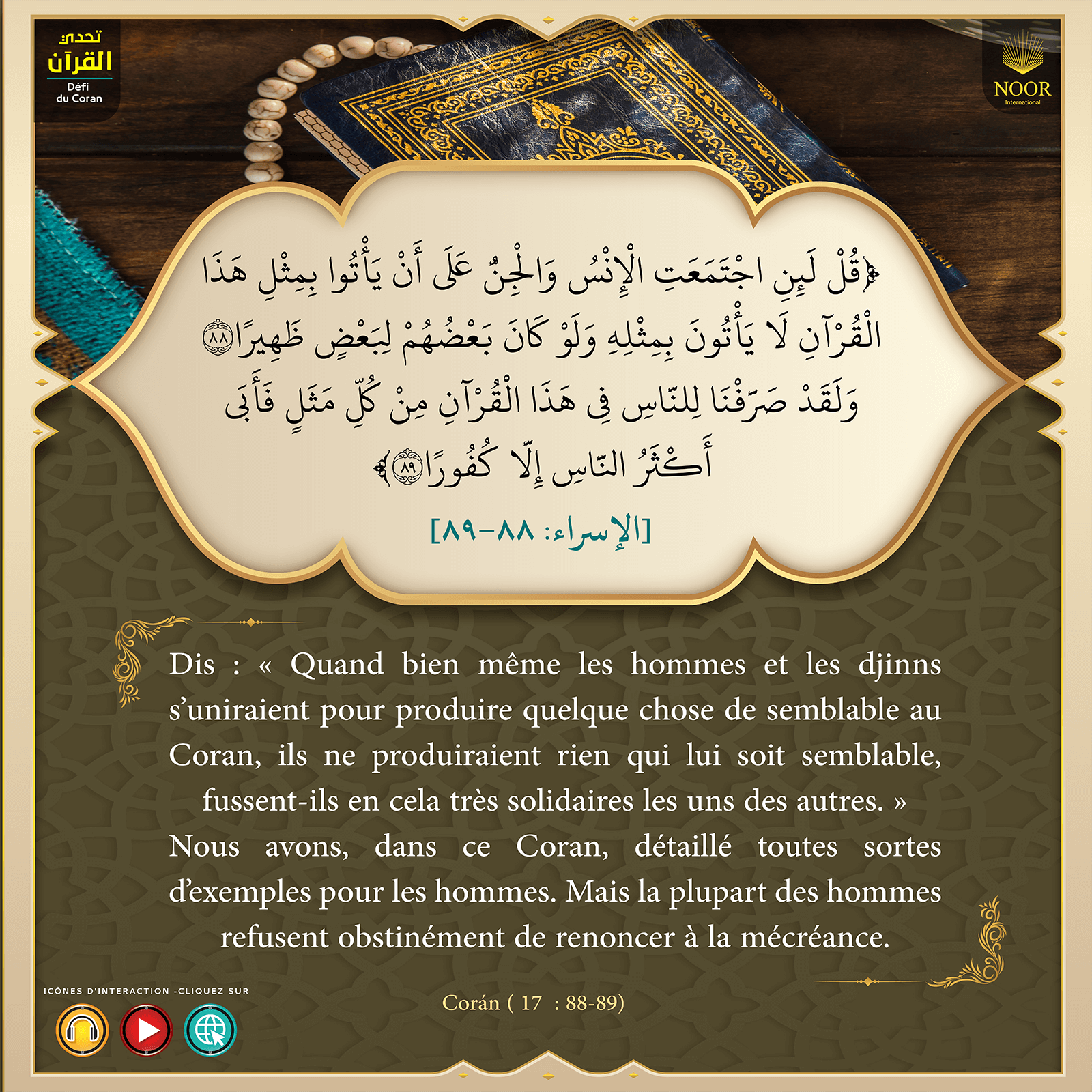Dis : « Quand bien même les hommes et les djinns s’uniraient pour produire quelque chose de semblable au Coran, ils ne produiraient rien qui lui soit semblable, fussent-ils en cela très solidaires les uns des autres. » Nous avons, dans ce Coran, détaillé toutes sortes d’exemples pour les hommes. Mais la plupart des hommes refusent obstinément de renoncer à la mécréance.