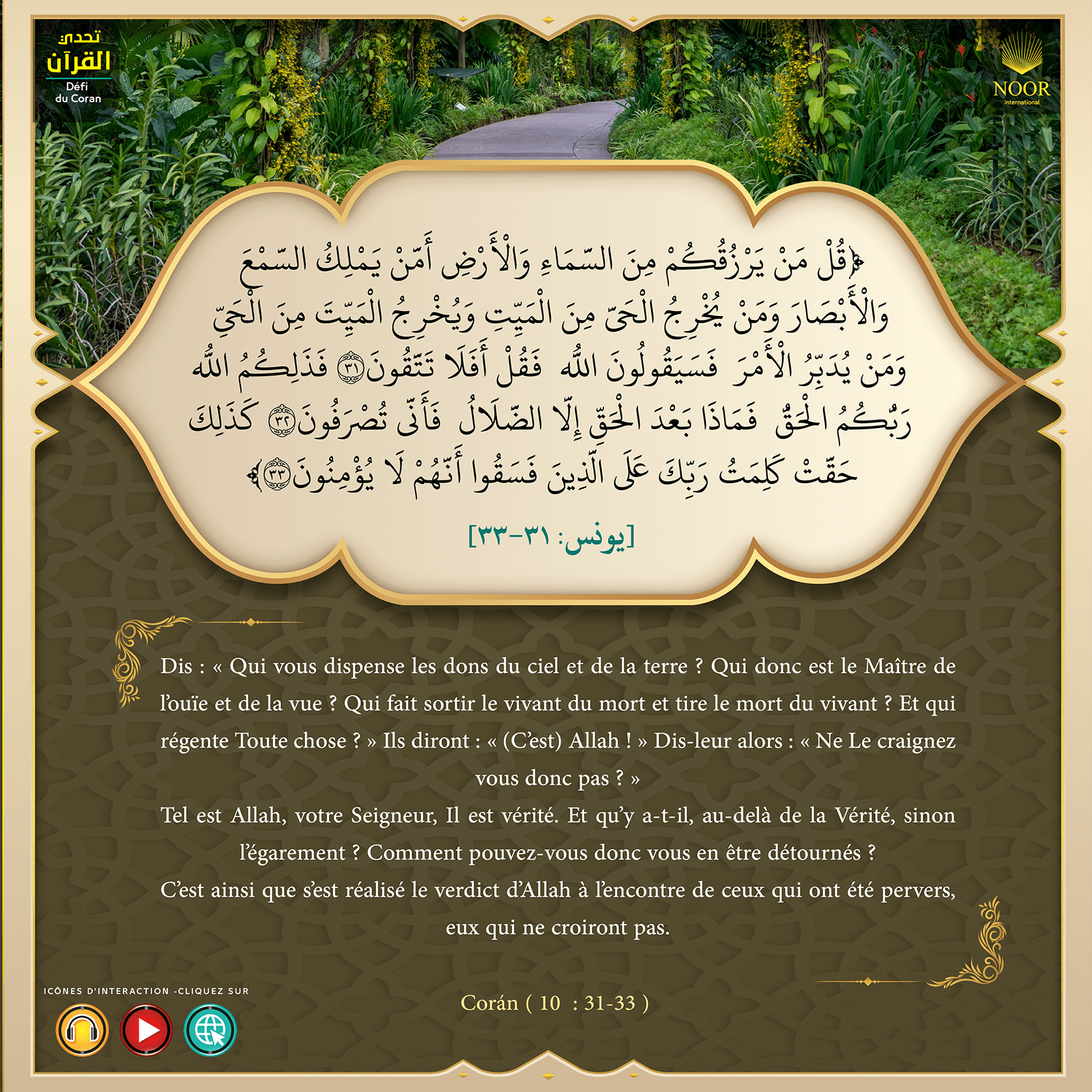 Dis : « Qui vous dispense les dons du ciel et de la terre ? Qui donc est le Maître de l’ouïe et de la vue ? Qui fait sortir le vivant du mort et tire le mort du vivant ? Et qui régente Toute chose ? » Ils diront : « (C’est) Allah ! » Dis-leur alors : « Ne Le craignez vous donc pas ? » Tel est Allah, votre Seigneur, Il est vérité. Et qu’y a-t-il, au-delà de la Vérité, sinon l’égarement ? Comment pouvez-vous donc vous en être détournés ? C’est ainsi que s’est réalisé le verdict d’Allah à l’encontre de ceux qui ont été pervers, eux qui ne croiront pas.