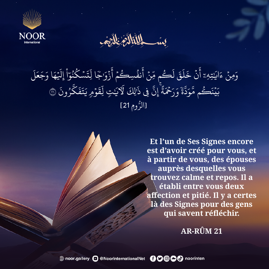 Et l’un de Ses Signes encore est d’avoir créé pour vous, et à partir de vous, des épouses auprès desquelles vous trouvez calme et repos. Il a établi entre vous deux affection et pitié. Il y a certes là des Signes pour des gens qui savent réfléchir.