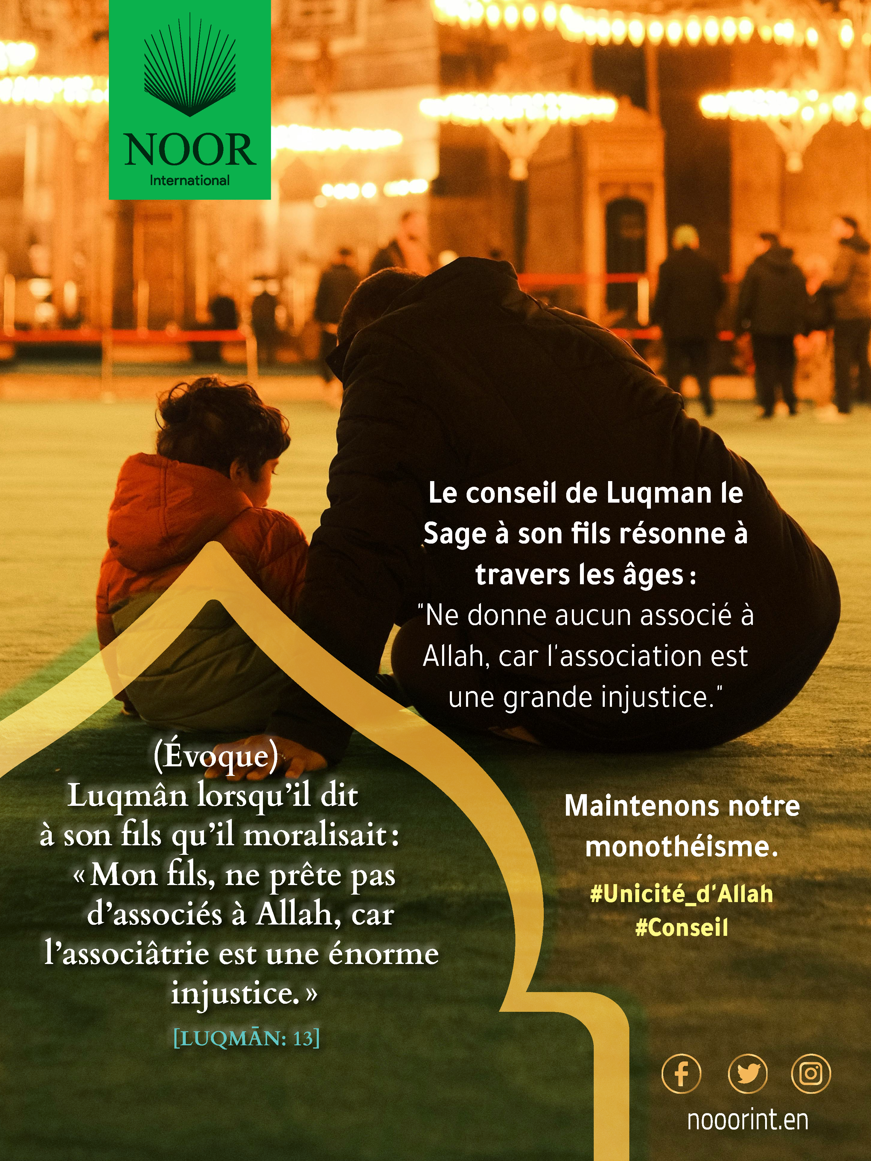 Le conseil de Luqman le Sage à son fils résonne à travers les âges : "Ne donne aucun associé à Allah, car l'association est une grande injustice." Maintenons notre monothéisme. #Unicité_d'Allah #Conseil