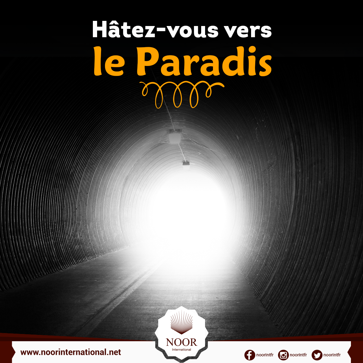 Il a aussi dit : « Courez donc à qui mieux mieux vers un pardon de votre Seigneur, (et vers) un Paradis aussi large que le ciel et la terre, ménagé pour ceux qui auront cru en Allah et en Ses Messagers. Telle est la faveur d’Allah, qu’Il accorde à qui Il veut. Et Allah est le Détenteur de la Faveur Suprême. » (sourate 57, Al Hadîd, Le Fer, verset 21