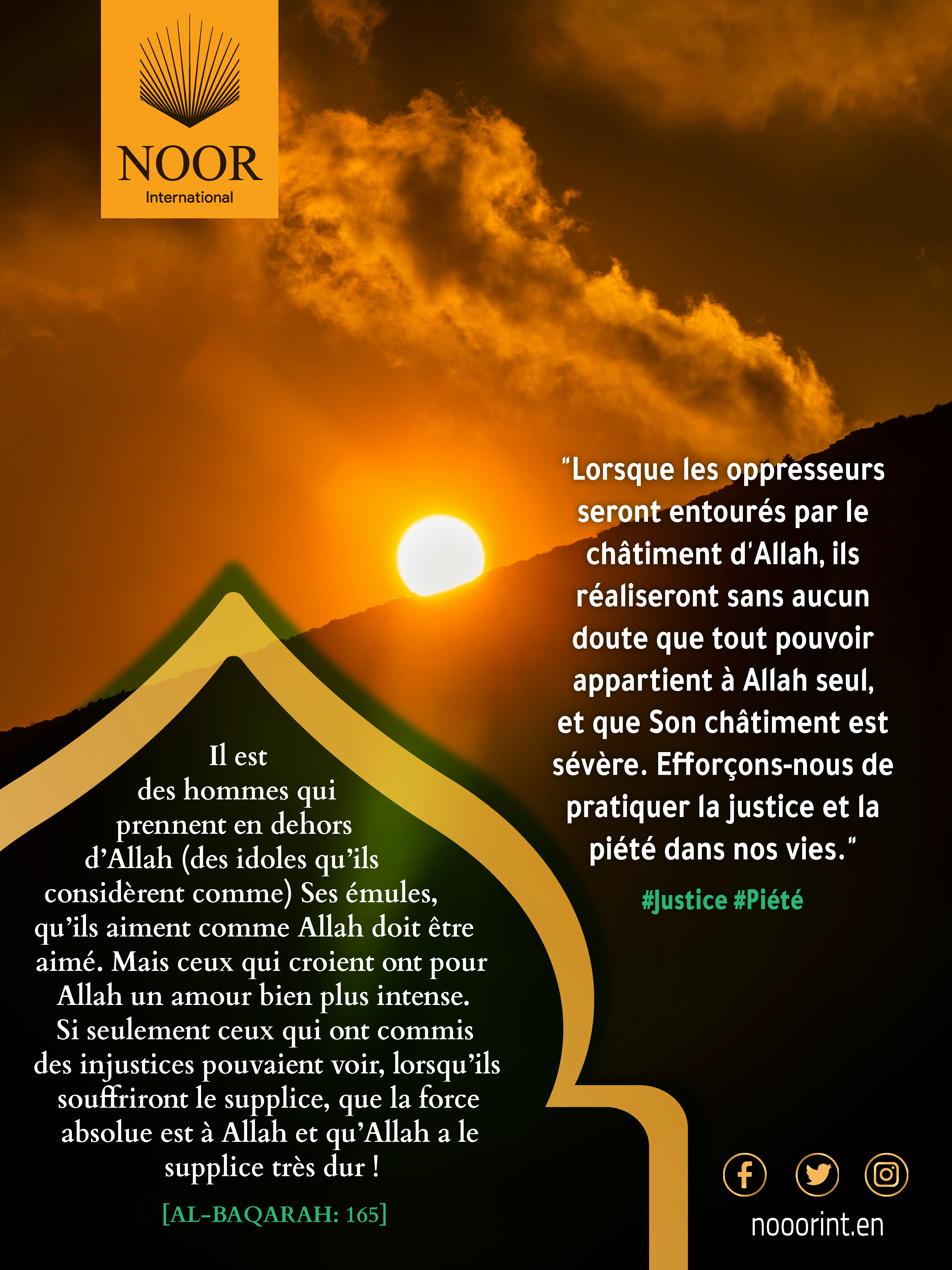 Lorsque les oppresseurs seront entourés par le châtiment d'Allah, ils réaliseront sans aucun doute que tout pouvoir appartient à Allah seul, et que Son châtiment est sévère. Efforçons-nous de pratiquer la justice et la piété dans nos vies." #Justice #Piété