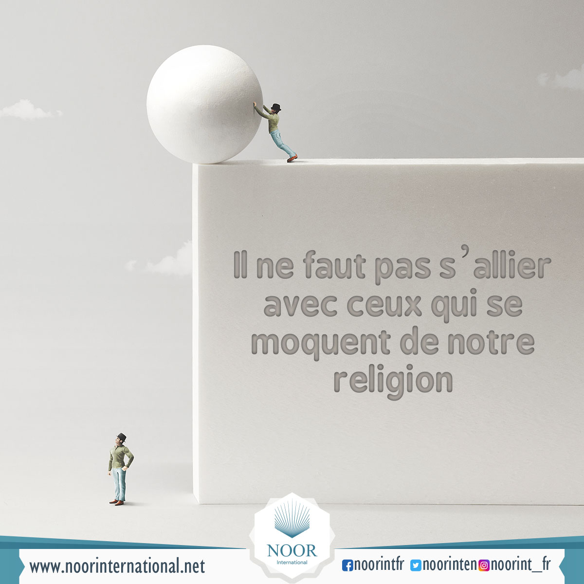 Allah nous a commandé de ne pas être alliés avec ceux qui tournent notre religion en dérision. Les croyants doivent faire attention à eux et s’en méfier.