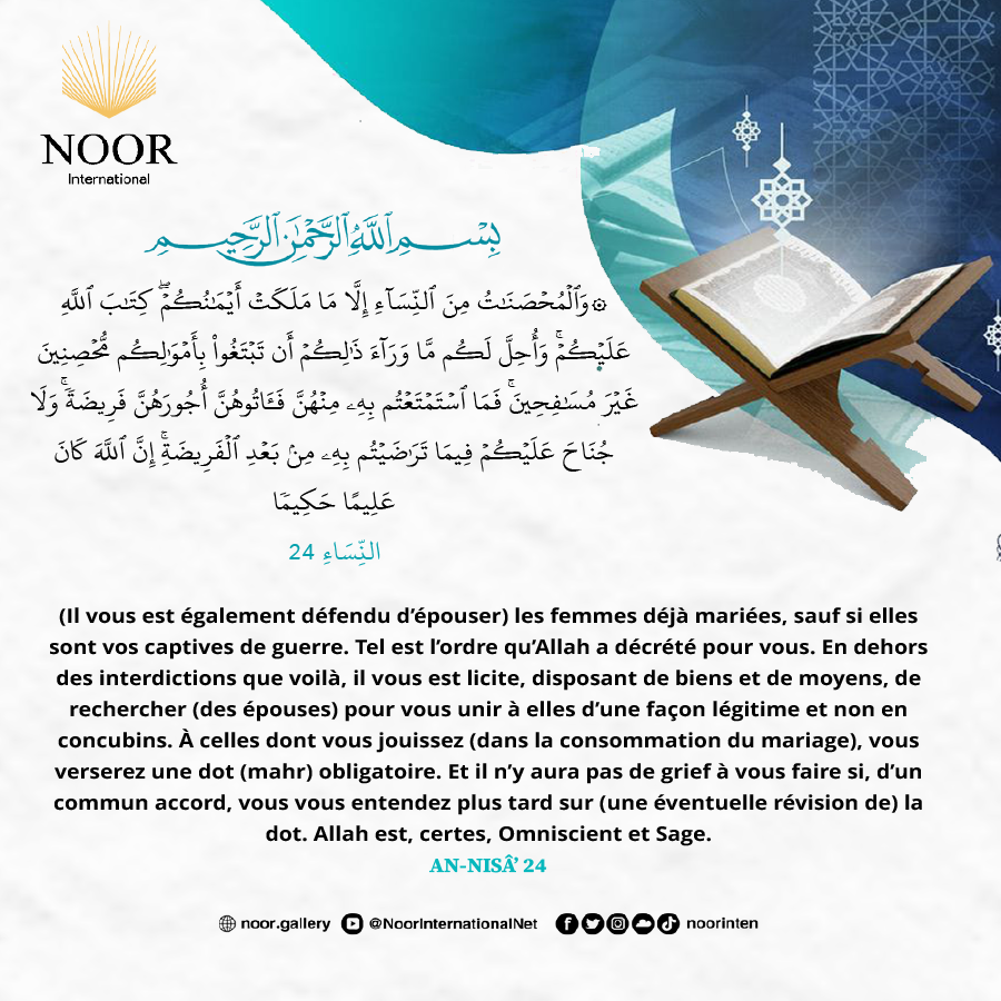 (Il vous est également défendu d’épouser) les femmes déjà mariées, sauf si elles sont vos captives de guerre.  Tel est l’ordre qu’Allah a décrété pour vous. En dehors des interdictions que voilà, il vous est licite, disposant de biens et de moyens, de rechercher (des épouses) pour vous unir à elles d’une façon légitime et non en concubins. À celles dont vous jouissez (dans la consommation du mariage), vous verserez une dot (mahr) obligatoire. Et il n’y aura pas de grief à vous faire si, d’un commun accord, vous vous entendez plus tard sur (une éventuelle révision de) la dot. Allah est, certes, Omniscient et Sage.