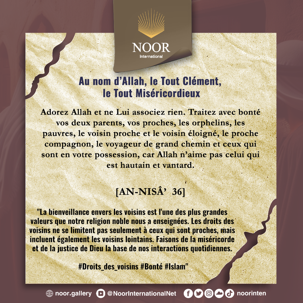 La bienveillance envers les voisins est l'une des plus grandes valeurs que notre religion noble nous a enseignées. Les droits des voisins ne se limitent pas seulement à ceux qui sont proches, mais incluent également les voisins lointains. Faisons de la miséricorde et de la justice de Dieu la base de nos interactions quotidiennes. #Droits_des_voisins #Bonté #Islam"