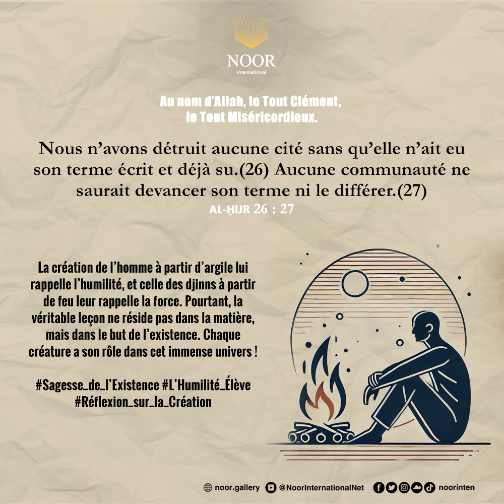 La création de l’homme à partir d’argile lui rappelle l’humilité, et celle des djinns à partir de feu leur rappelle la force. Pourtant, la véritable leçon ne réside pas dans la matière, mais dans le but de l’existence. Chaque créature a son rôle dans cet immense univers ! #Sagesse_de_l’Existence #L’Humilité_Élève #Réflexion_sur_la_Création