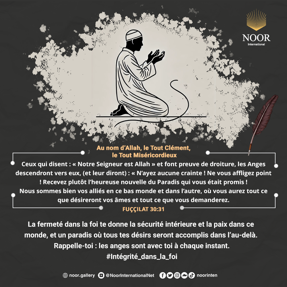 La fermeté dans la foi te donne la sécurité intérieure et la paix dans ce monde, et un paradis où tous tes désirs seront accomplis dans l’au-delà. Rappelle-toi : les anges sont avec toi à chaque instant. #Intégrité_dans_la_foi