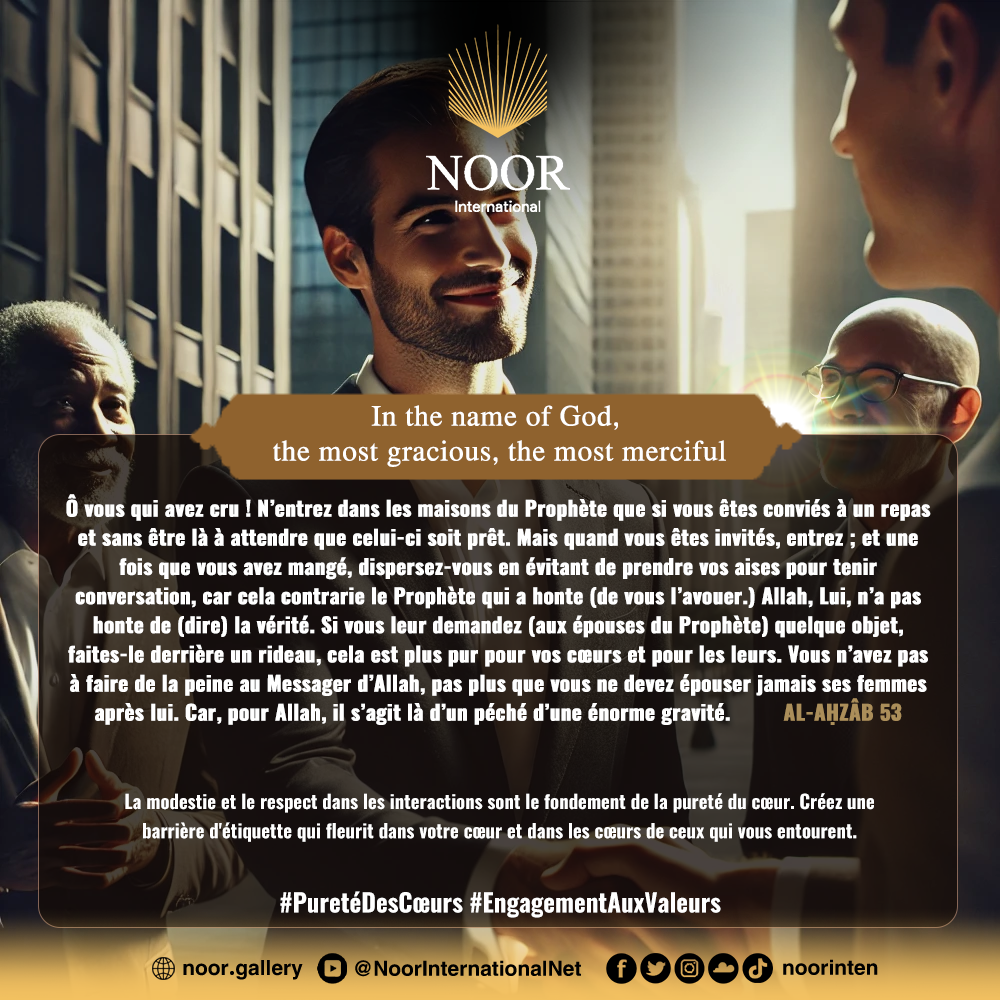La modestie et le respect dans les interactions sont le fondement de la pureté du cœur. Créez une barrière d'étiquette qui fleurit dans votre cœur et dans les cœurs de ceux qui vous entourent. #PuretéDesCœurs #EngagementAuxValeurs