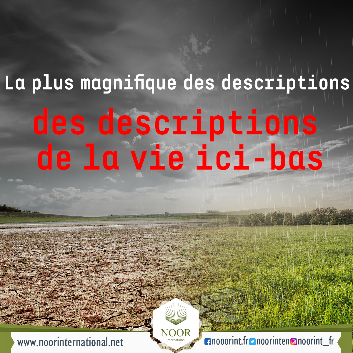 Le Coran compare la vie ici-bas à une terre aride sur laquelle tombe la pluie et qui devient luxuriante. Puis un vent puissant se met à souffler sur elle et voilà que ses récoltes en sont détruites.