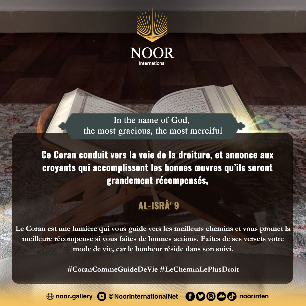 Le Coran est une lumière qui vous guide vers les meilleurs chemins et vous promet la meilleure récompense si vous faites de bonnes actions. Faites de ses versets votre mode de vie, car le bonheur réside dans son suivi. #CoranCommeGuideDeVie #LeCheminLePlusDroit