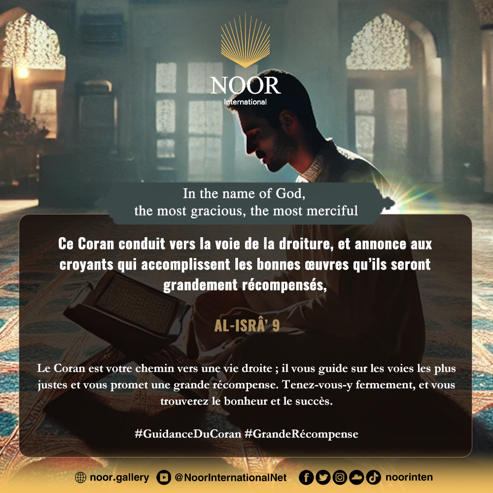 Le Coran est votre chemin vers une vie droite ; il vous guide sur les voies les plus justes et vous promet une grande récompense. Tenez-vous-y fermement, et vous trouverez le bonheur et le succès. #GuidanceDuCoran #GrandeRécompense