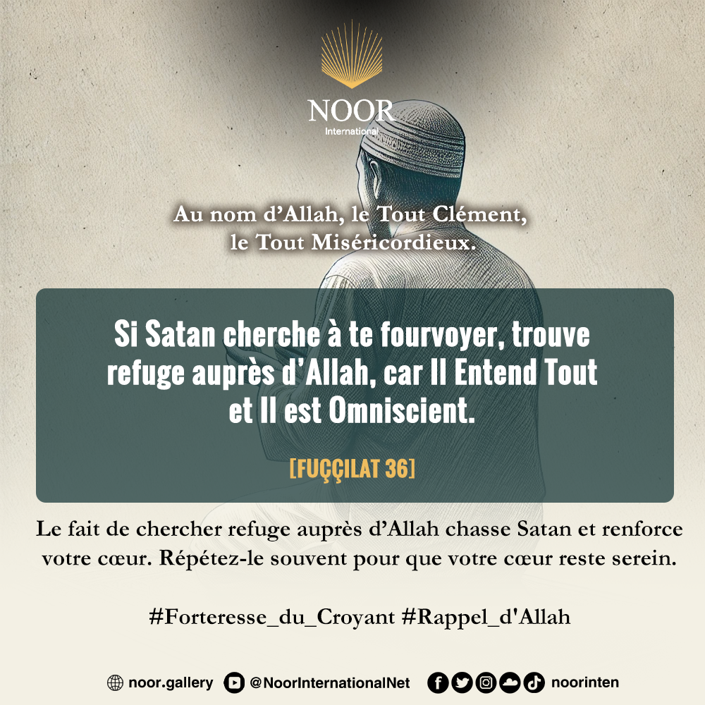 Le fait de chercher refuge auprès d’Allah chasse Satan et renforce votre cœur. Répétez-le souvent pour que votre cœur reste serein. #Forteresse_du_Croyant #Rappel_d'Allah