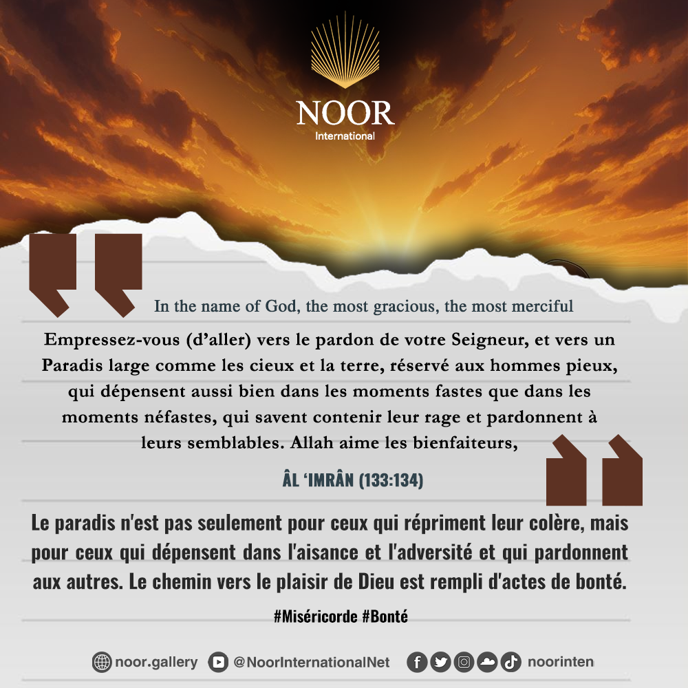 "Le paradis n'est pas seulement pour ceux qui répriment leur colère, mais pour ceux qui dépensent dans l'aisance et l'adversité et qui pardonnent aux autres. Le chemin vers le plaisir de Dieu est rempli d'actes de bonté." #Miséricorde #Bonté