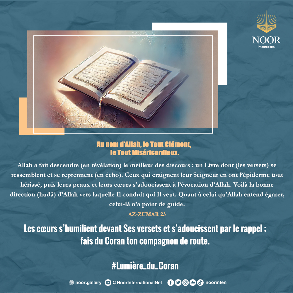 Les cœurs s’humilient devant Ses versets et s’adoucissent par le rappel ; fais du Coran ton compagnon de route. #Lumière_du_Coran