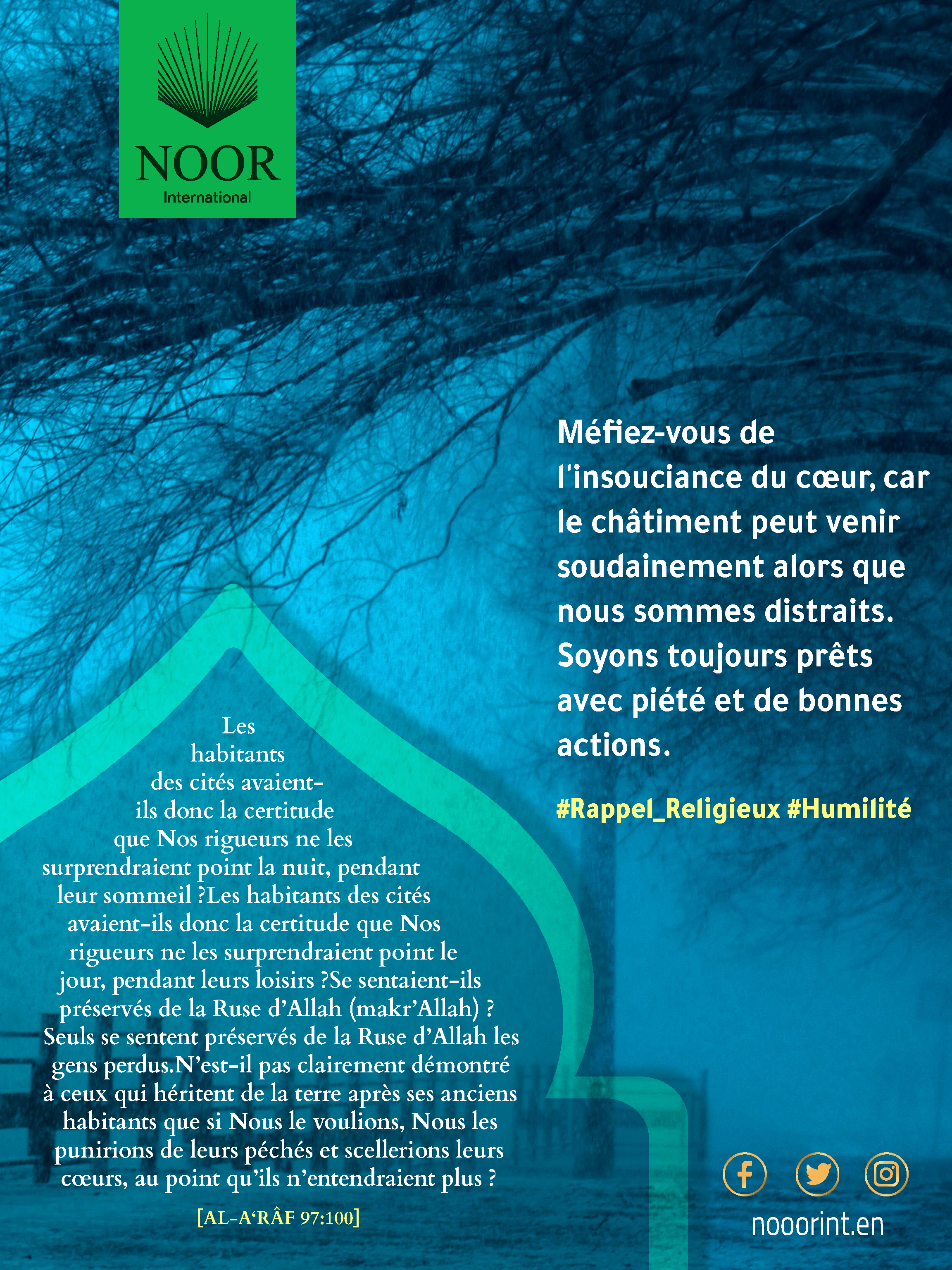 Méfiez-vous de l'insouciance du cœur, car le châtiment peut venir soudainement alors que nous sommes distraits. Soyons toujours prêts avec piété et de bonnes actions. #Rappel_Religieux #Humilité