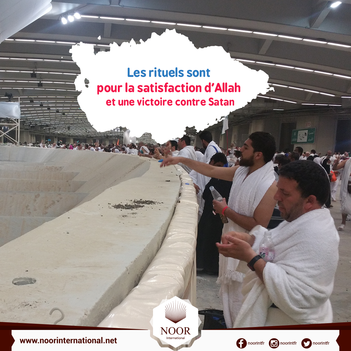 Lorsque le musulman accomplit le tawaf (circumbulation) autour de la Kaâba , puis le sa'yi (le va-et-vient rapide) entre Safa et Marwa, puis se rend à la station de Arafat et se remémore la présence du Prophète en cet endroit lors du Pèlerinage de l'adieu prononçant le Prêche de l'adieu, et qu'il fait face au Mont de la Miséricorde, ses yeux débordent de larmes et son cœur s'emplit de repentir. Les lèvres invoquent le pardon divin et il semble à l'homme qu'il a obtenu la satisfaction de son Seigneur et s'est débarassé de ses péchés, des obsessions de son âme et des murmures de Satan. Il symbolise alors cete victoire en lançant les jamarât (cailloux rituels). Il s'en retourne, après avoir accompli les rituels du pèlerinage, débarassé de ses fardeaux avec le sentiment qu'Allah lui a pardonné.