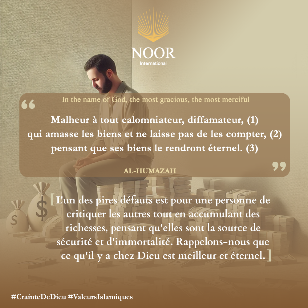 "L'un des pires défauts est pour une personne de critiquer les autres tout en accumulant des richesses, pensant qu'elles sont la source de sécurité et d'immortalité. Rappelons-nous que ce qu'il y a chez Dieu est meilleur et éternel." #CrainteDeDieu #ValeursIslamiques