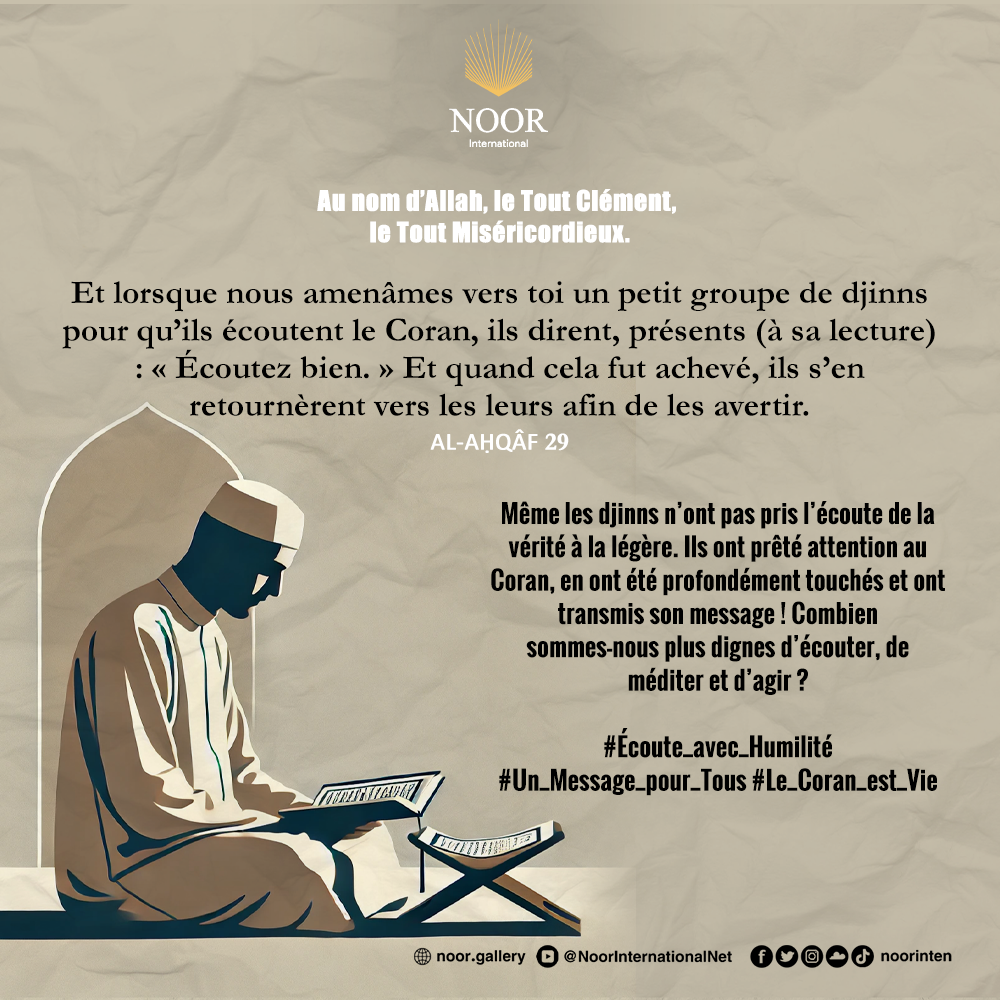 Même les djinns n’ont pas pris l’écoute de la vérité à la légère. Ils ont prêté attention au Coran, en ont été profondément touchés et ont transmis son message ! Combien sommes-nous plus dignes d’écouter, de méditer et d’agir ? #Écoute_avec_Humilité #Un_Message_pour_Tous #Le_Coran_est_Vie