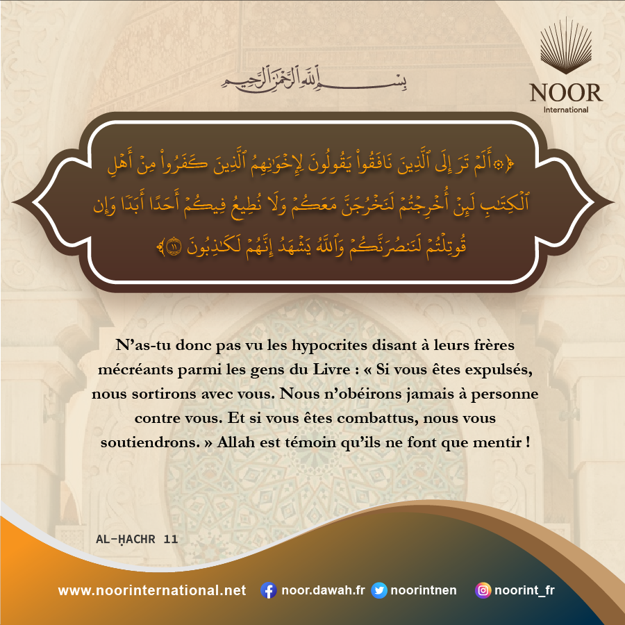 N’as-tu donc pas vu les hypocrites disant à leurs frères mécréants parmi les gens du Livre : « Si vous êtes expulsés, nous sortirons avec vous. Nous n’obéirons jamais à personne contre vous. Et si vous êtes combattus, nous vous soutiendrons. » Allah est témoin qu’ils ne font que mentir !