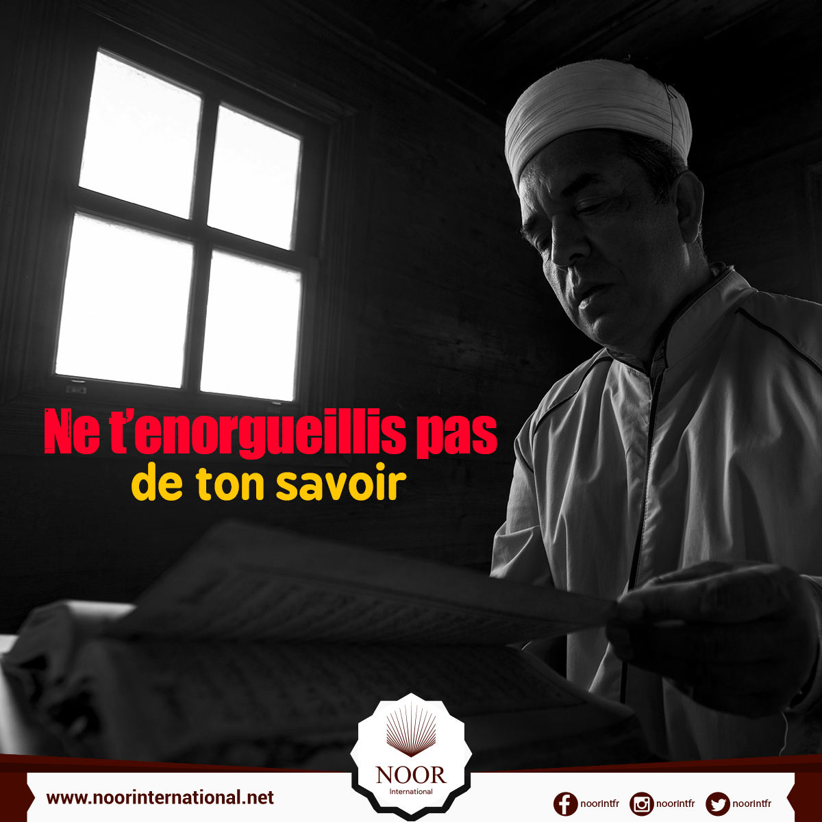 Ne t’enorgueillis jamais de ton savoir car au-dessus de chaque savant il y quelqu’un de plus savant, et ce jusqu’à ce que le savoir finisse auprès d’Allah, le Connaisseur de l’Inconnaissable et du Témoignage