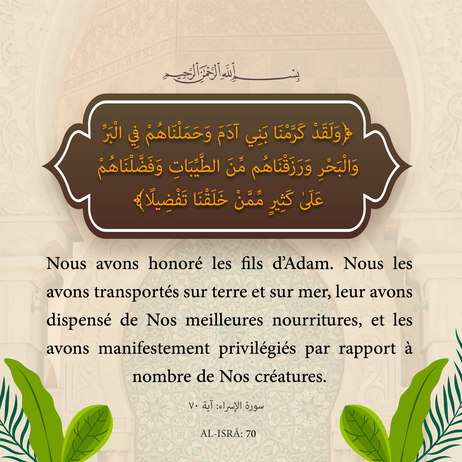 Nous avons honoré les fils d’Adam. Nous les avons transportés sur terre et sur mer, leur avons dispensé de Nos meilleures nourritures, et les avons manifestement privilégiés par rapport à nombre de Nos créatures.