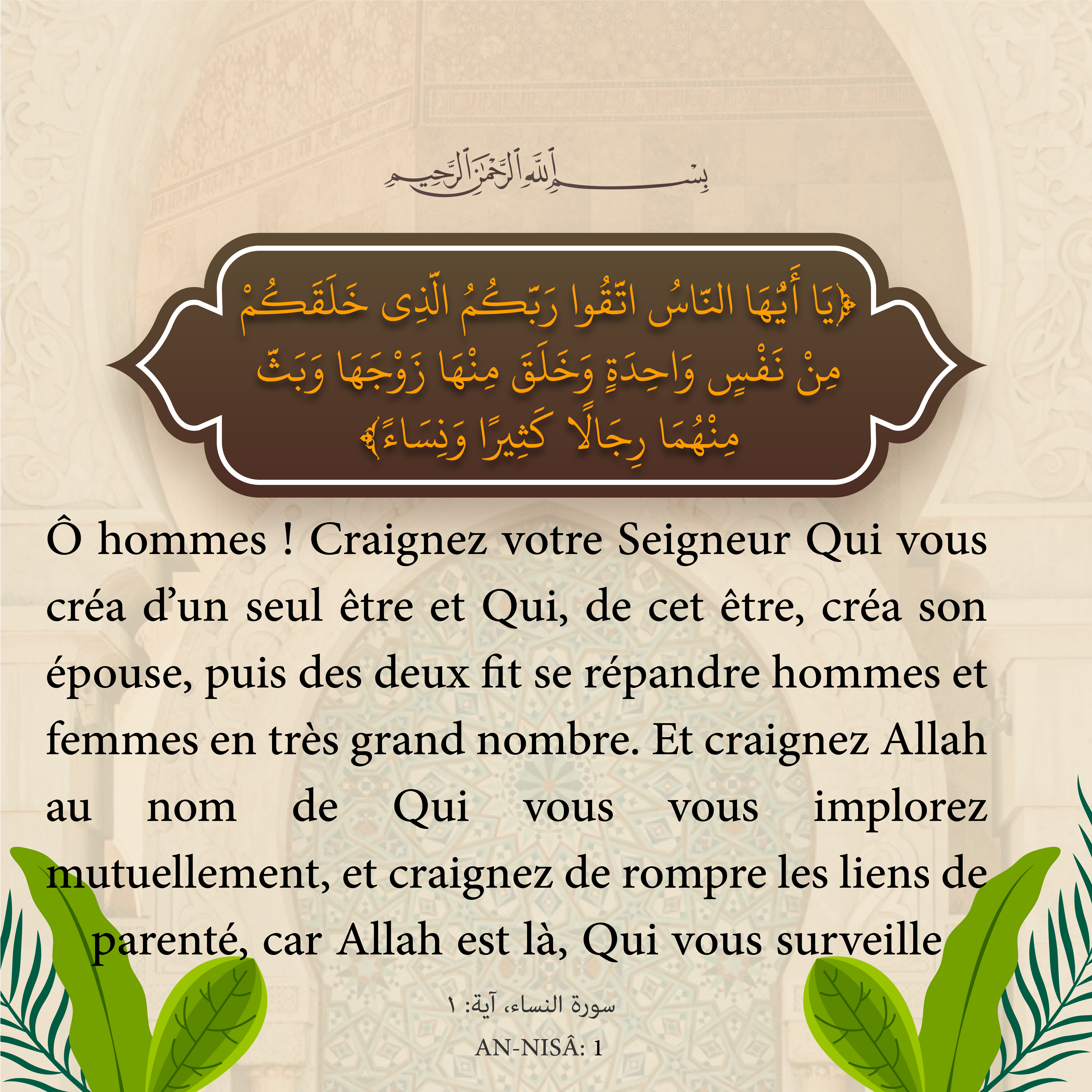 Ô hommes ! Craignez votre Seigneur Qui vous créa d’un seul être et Qui, de cet être, créa son épouse, puis des deux fit se répandre hommes et femmes en très grand nombre. Et craignez Allah au nom de Qui vous vous implorez mutuellement, et craignez de rompre les liens de parenté, car Allah est là, Qui vous surveille.