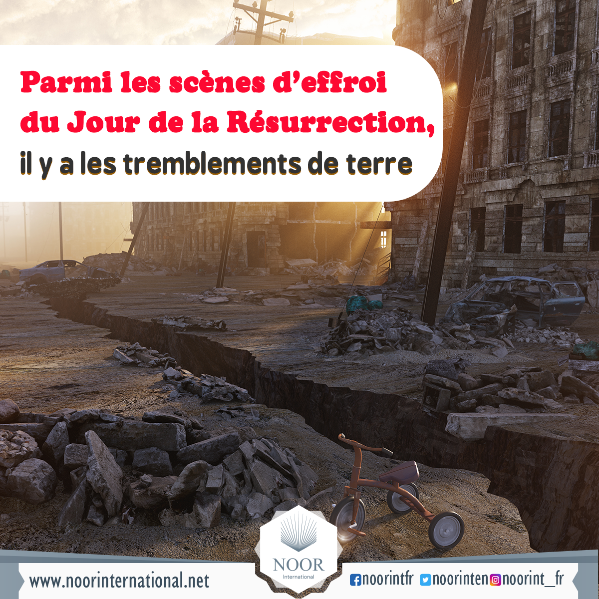 La terre tremblera avec force et les montagnes s’effriteront devant tes yeux jusqu’à devenir une poussière qui flotte dans l’air. Alors sera venu le Jour de la Résurrection