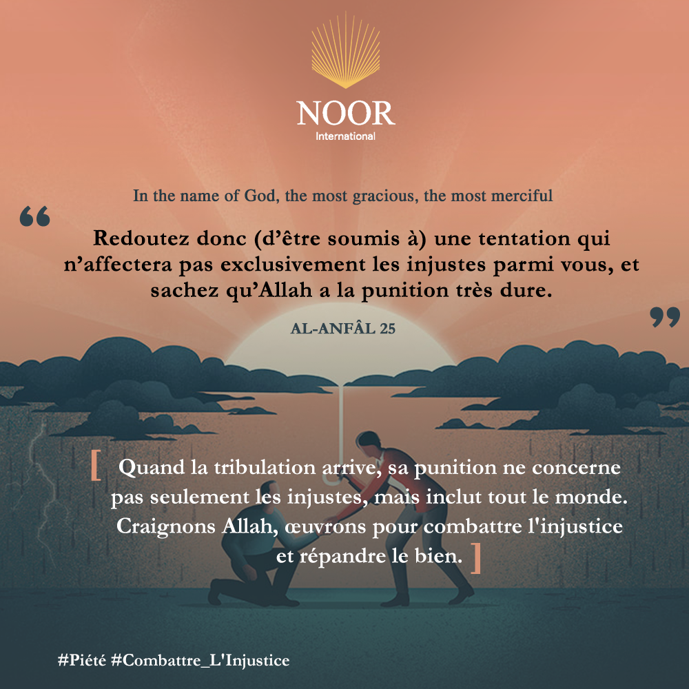 Quand la tribulation arrive, sa punition ne concerne pas seulement les injustes, mais inclut tout le monde. Craignons Allah, œuvrons pour combattre l'injustice et répandre le bien. #Piété #Combattre_L'Injustice