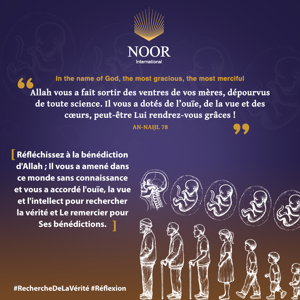Réfléchissez à la bénédiction d'Allah ; Il vous a amené dans ce monde sans connaissance et vous a accordé l'ouïe, la vue et l'intellect pour rechercher la vérité et Le remercier pour Ses bénédictions. #RechercheDeLaVérité #Réflexion