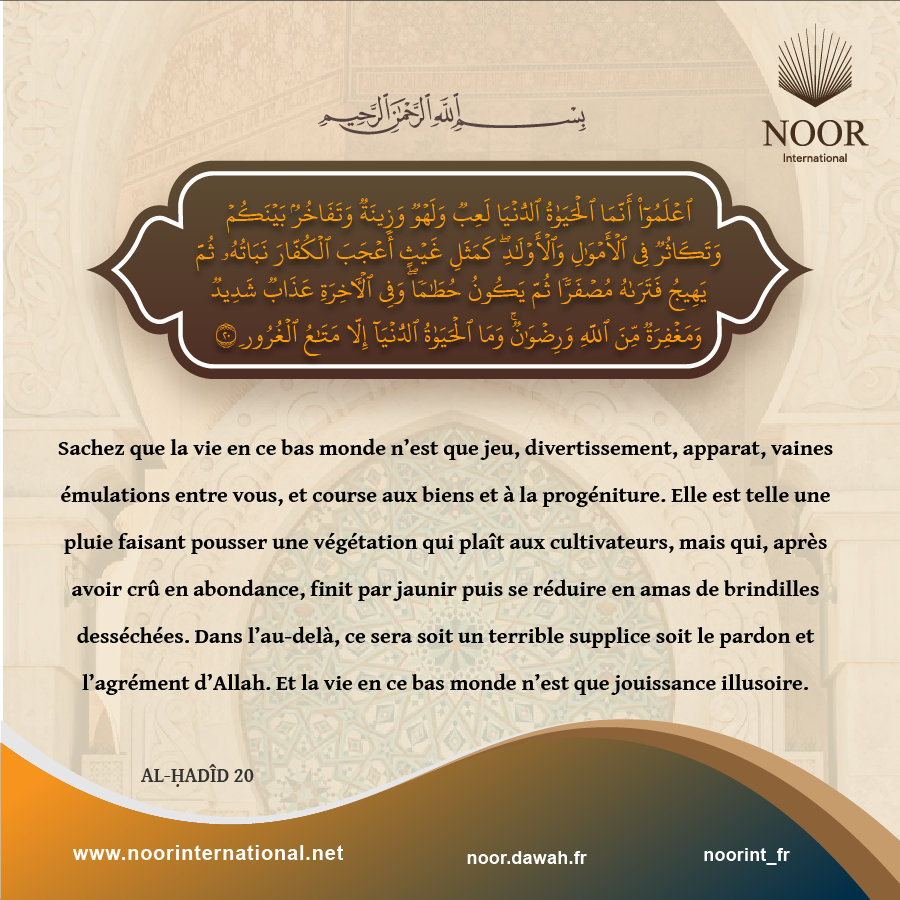 Sachez que la vie en ce bas monde n’est que jeu, divertissement, apparat, vaines émulations entre vous, et course aux biens et à la progéniture. Elle est telle une pluie faisant pousser une végétation qui plaît aux cultivateurs, mais qui, après avoir crû en abondance, finit par jaunir puis se réduire en amas de brindilles desséchées. Dans l’au-delà, ce sera soit un terrible supplice soit le pardon et l’agrément d’Allah. Et la vie en ce bas monde n’est que jouissance illusoire.