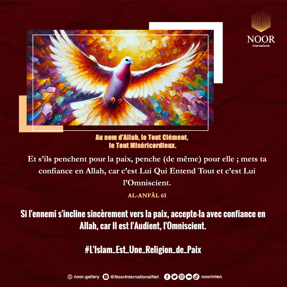 Si l'ennemi s'incline sincèrement vers la paix, accepte-la avec confiance en Allah, car Il est l'Audient, l'Omniscient. #L'Islam_Est_Une_Religion_de_Paix