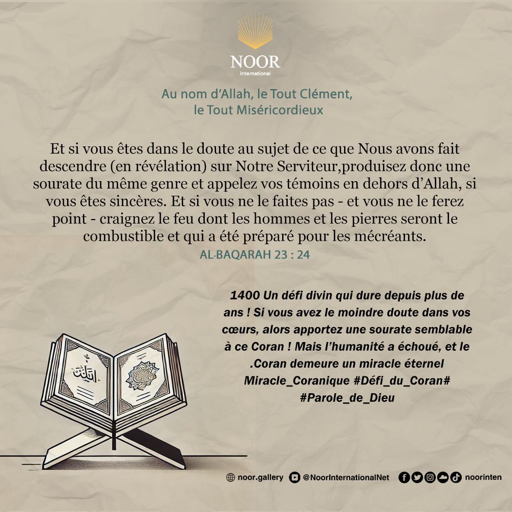 Un défi divin qui dure depuis plus de 1400 ans ! Si vous avez le moindre doute dans vos cœurs, alors apportez une sourate semblable à ce Coran ! Mais l’humanité a échoué, et le Coran demeure un miracle éternel.