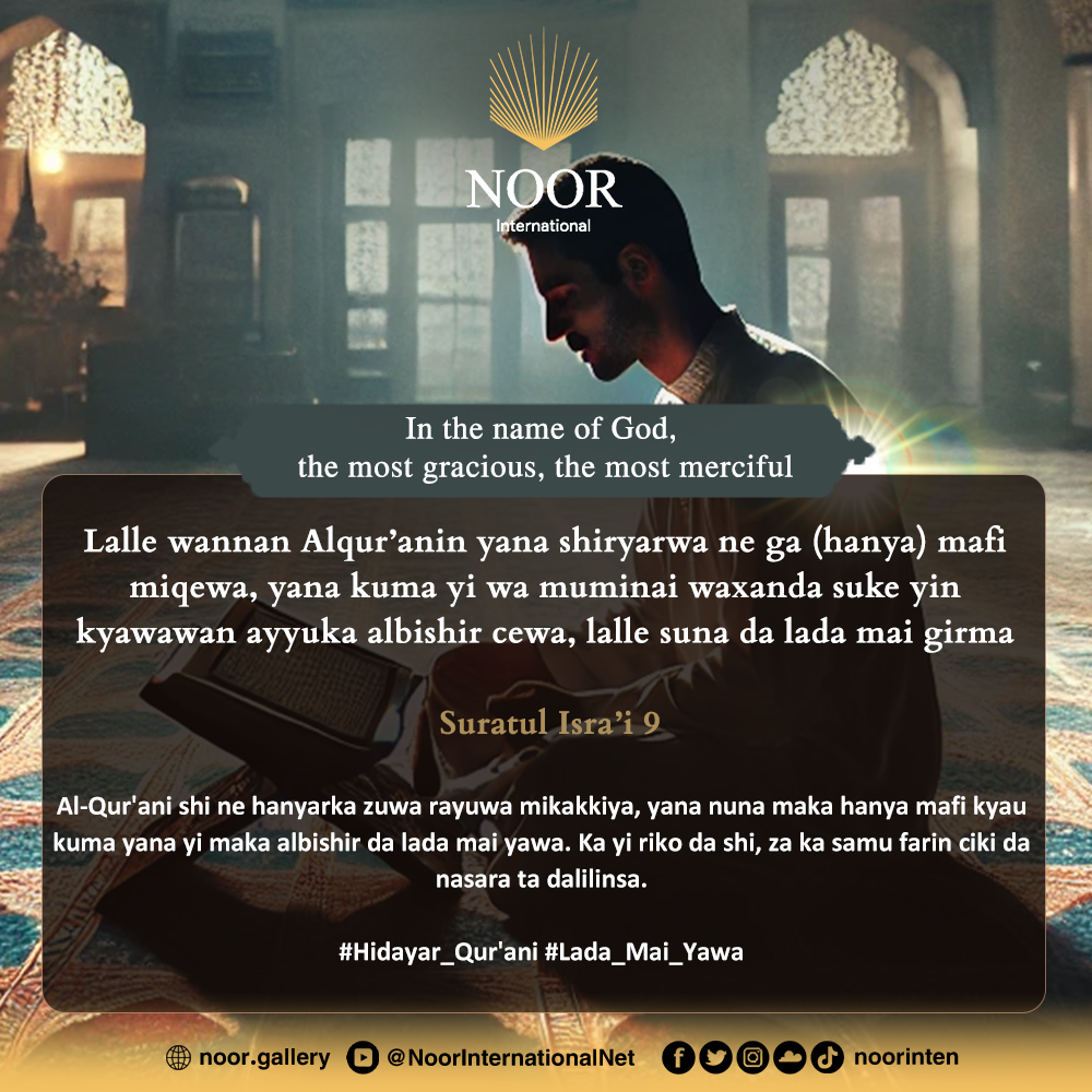 Al-Qur'ani shi ne hanyarka zuwa rayuwa mikakkiya, yana nuna maka hanya mafi kyau kuma yana yi maka albishir da lada mai yawa. Ka yi riko da shi, za ka samu farin ciki da nasara ta dalilinsa. #Hidayar_Qur'ani #Lada_Mai_Yawa