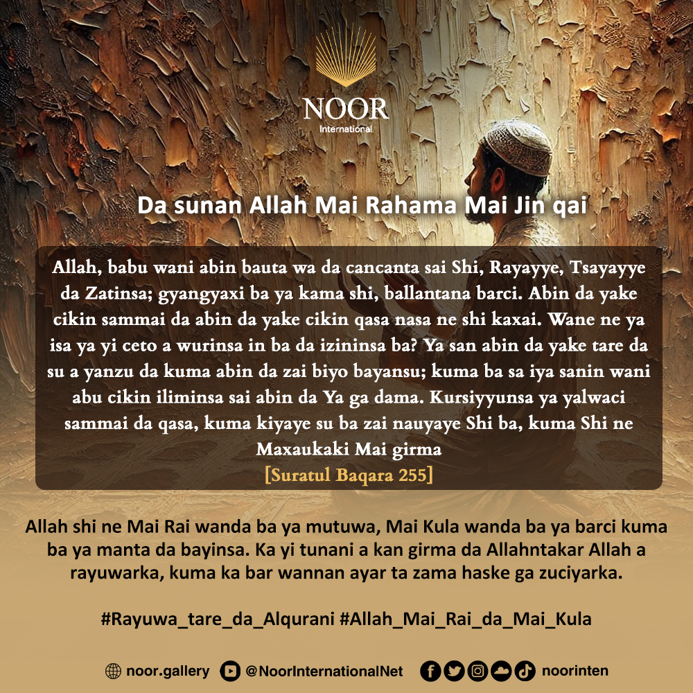 Allah shi ne Mai Rai wanda ba ya mutuwa, Mai Kula wanda ba ya barci kuma ba ya manta da bayinsa. Ka yi tunani a kan girma da Allahntakar Allah a rayuwarka, kuma ka bar wannan ayar ta zama haske ga zuciyarka. #Rayuwa_tare_da_Alqurani #Allah_Mai_Rai_da_Mai_Kula