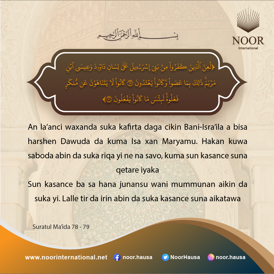 An la’anci waxanda suka kafirta daga cikin Bani-Isra’ila a bisa harshen Dawuda da kuma Isa xan Maryamu. Hakan kuwa saboda abin da suka riqa yi ne na savo, kuma sun kasance suna qetare iyaka Sun kasance ba sa hana junansu wani mummunan aikin da suka yi. Lalle tir da irin abin da suka kasance suna aikatawa