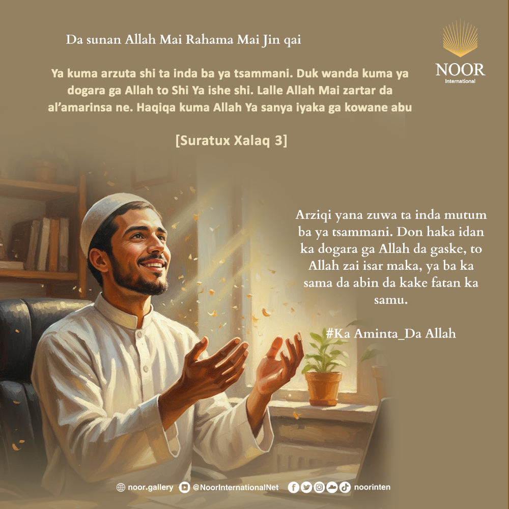 Arziqi yana zuwa ta inda mutum ba ya tsammani. Don haka idan ka dogara ga Allah da gaske, to Allah zai isar maka, ya ba ka sama da abin da kake fatan ka samu.